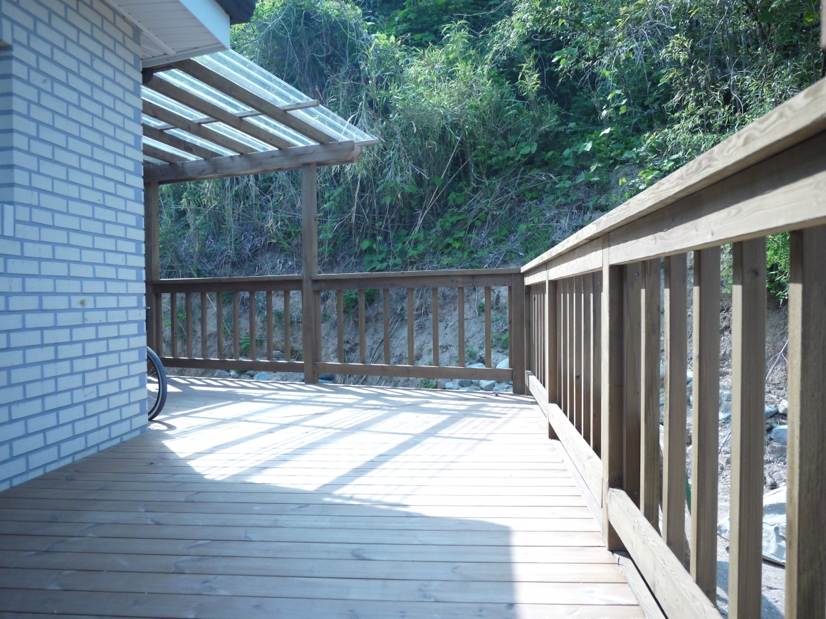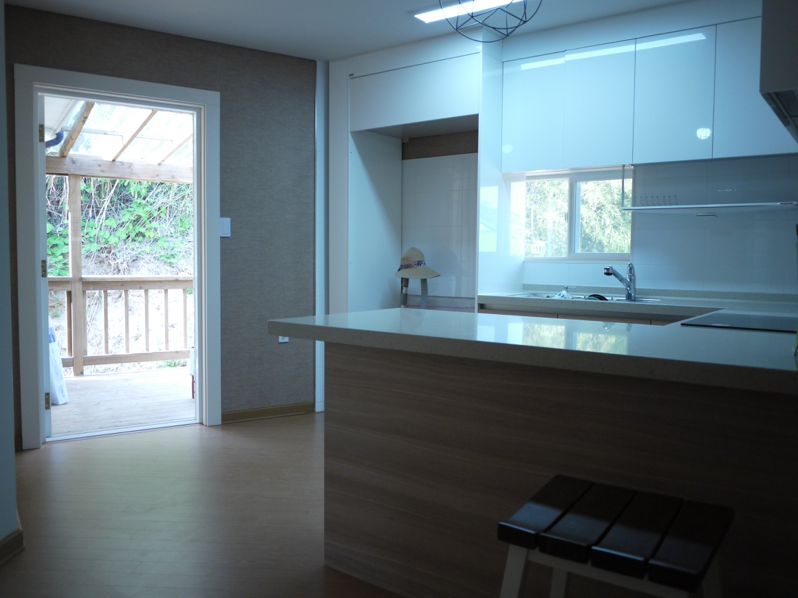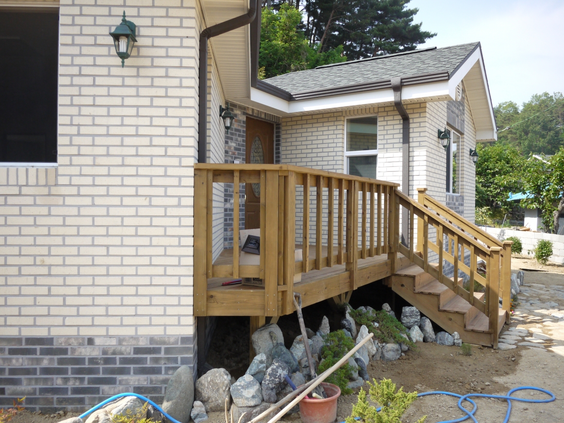 ▶건축개요 및 건축면적 위치: 경북 울진군 평해읍 월송리 건축면적: 92.7.㎡ 대지면적: 424㎡ 연 면적: 92.7㎡ 지역/지구: 제1종일반주거지역 구 조: 경량목구조 ▶조경 및 데크공사 조경공사: 건축주 직접시공 데크공사: POST 4×4, BEAM 4×4, JOIST 2×6, DECK 1×4 탄화목 핀란드 LUNAWOOD로 시공 국내에서 유통되는 방부목은 수년전 국내 방부처리규정이 인정된 후로 내구성이나 변형이 만족스럽지 않아서 건축주 분들이 원하지 않을 경우 대리석으로 시공을 하게 되는데, 나무의 느낌을 원하고 시공비를 고려해서 핀란드 루나우드를 선택하였습니다. 상판은 못구멍 없이 클립으로 하나하나 시공을 하였습니다. ▶기초 및 골조공사 통방석기초: 본체의 줄기초와 철근배근을 연결한 후 통방석방식의 방석기초로 연계하는 기초형태 골조공사: 외벽 2×6, 내벽 2×4, 다락방바닥장선 2×10, 서까래 2×10으로 시공한 경량목구조 ▶외부마감 및 지붕공사 외부마감: 점토벽돌 지붕공사: 2중 그림자 슁글 시공 ▶내부인테리어 창호는 미국현지에서 조립해서 수입된 PLYGAM 2등급 창호, 중문은 베리굿도어 3연동, 내부문은 홍송원목문, 거실천장 매지몰딩, 문선 및 창호봉틀과 몰딩은 유럽산 Golman S.P.F 원목 시공 한양하우징 내부 인테리어공사는 계약시 서류에 제품 일체를 명시하여 건축주와의 투명성을 중요하게 생각합니다.