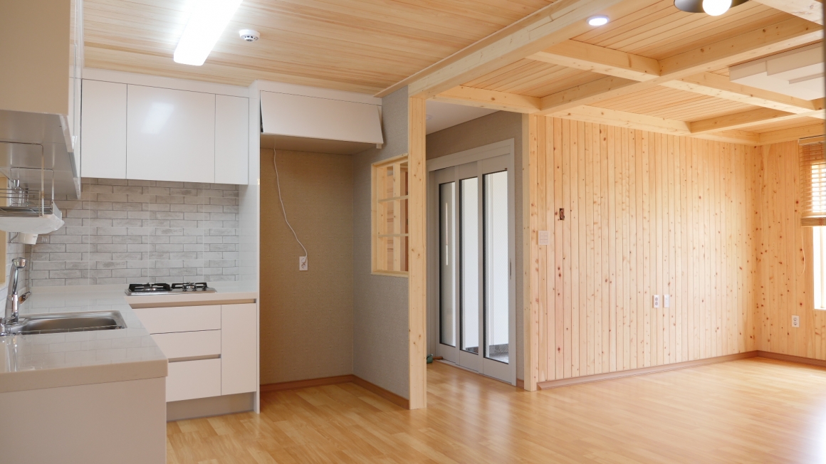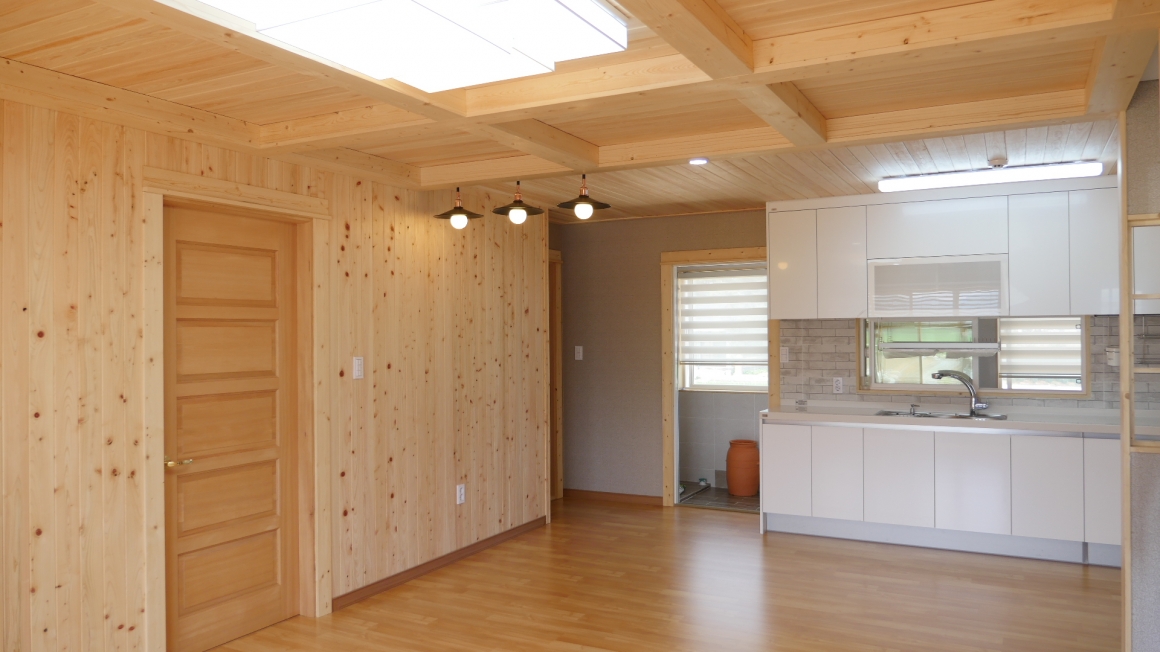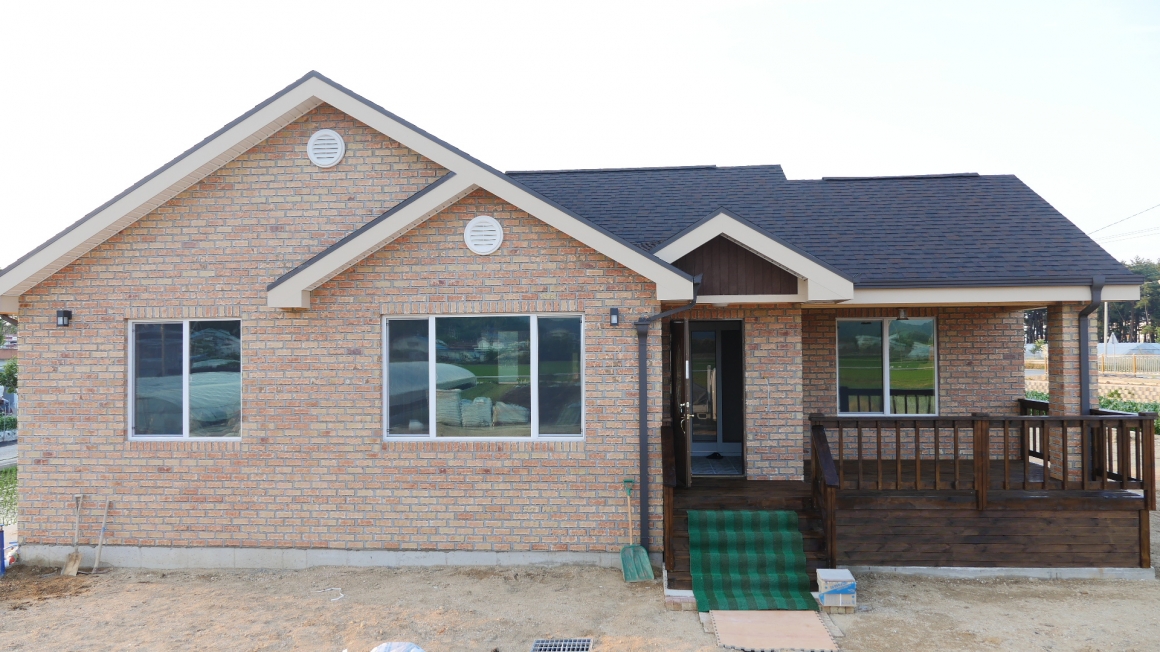 ▶건축개요 및 건축면적 위치: 경북 울진군 평해읍 월송리 건축면적: 93.8.㎡ 대지면적: 1107㎡ 연 면적: 104.5㎡ 지역/지구: 계획관리지역 구 조: 경량목구조 ▶조경 및 데크공사 옹벽공사: 13mm 단배근으로 200피치로 배근한후, 강도210 콘크리트 시공 데크공사: POST 4×4, BEAM 4×4, JOIST 2×6, DECK 1×4 방부목으로 시공 ▶기초 및 골조공사 줄기초: 본체의 줄기초와 철근배근을 연결한 후 외부벽체와 내부벽체를 연계하는 기초형태 골조공사: 외벽 2×6, 내벽 2×4, 다락방바닥장선 2×10, 서까래 2×10으로 시공한 경량목구조 ▶외부마감 및 지붕공사 외부마감: 점토벽돌 지붕공사: 2중 그림자 슁글 시공 ▶내부인테리어 창호는 북미산 3중유리 2등급 북미식창호, 중문은 베리굿도어 3연동, 내부문은 홍송원목도어 문선 및 창호봉틀과 몰딩은 유럽산 Golman S.P.F 원목 시공 한양하우징 내부 인테리어공사는 계약시 서류에 제품 일체를 명시하여 건축주와의 투명성을 중요하게 생각합니다.