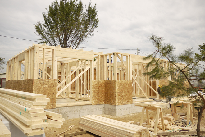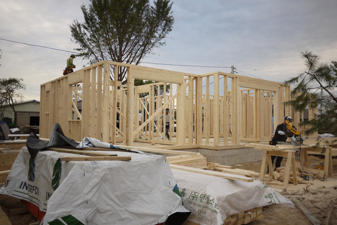 외부 OSB합판을 시공하는 사진이며, 시공시 못간격은 물론이고 목구조는 합판의 횡력을 중요하게 생각하는 시공으로블럭방식으로 물려서 창문과 문을 이어주는게 중요합니다.
