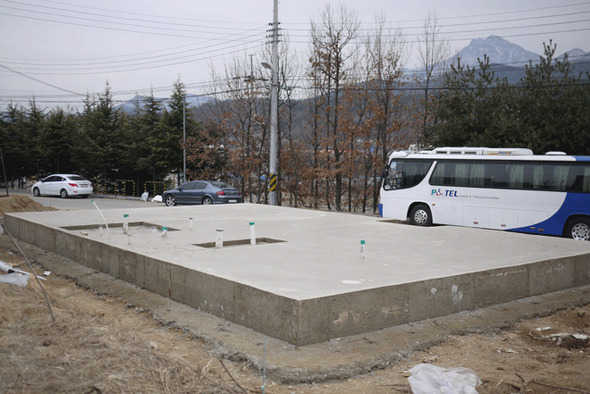 1층 바닥면적 24평, 거실1, 방3, 주방1, 다용도실1, 공동화장실1, 간이화장실1(계단실아래), 현관1, 내부계단 통기초콘크리트타설 방식으로 2회 타설하였으며, 철근10mm, 13mm 하이바 정품철근을 사용하였으며, 슬라브 철근은 20mm 간격으로 쌍줄로 시공하였습니다. 콘크리트는 210강도에 슬러프는 날씨가 추운 탓에 10이하로 선택을 해서 새벽온도가 영하로 떨어지지않는 날 타설하였습니다.