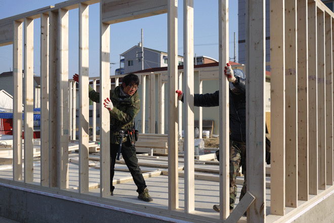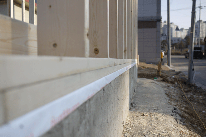 2×4, 2×6 프레임목재는 규격은 하나이지만 수입처에 따라서 등급이 달라집니다. 국내에는 보통 일반적인 구조용 3등급에서 2등급까지 사용을 하며, 좋은 것은 2등급 중에서 High Line 또는 Prime으로 따로 표기를 하여 유통을 합니다. 저희 한양하우징 목조현장은 위에 사진에서 보시는 바와 같이 나무에 피죽이 하나도 없는 곧은 High Line이나 Prime등급을 사용하는 것을 원칙이자 자존심으로 지켜나가고 있습니다.