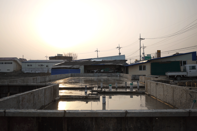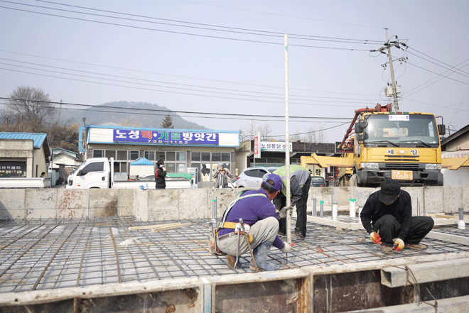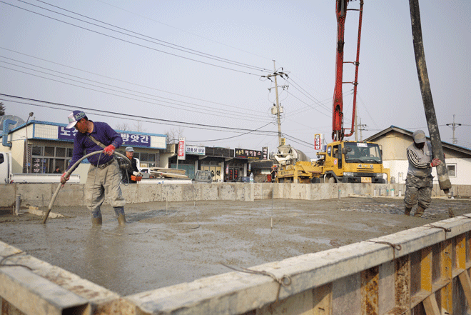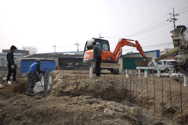 본 건물은 근린생활시설 음식점 30평과 주택 7평을 복합적으로 이루어지며, 도로면보다 건축지면이 낮아 뒤쪽으로 높이1.5m, 두께250mm 옹벽공사를 선행하였구요. 콘크리트타설은 버림1회 슬라브1회로 통기초형식으로 하였습니다.