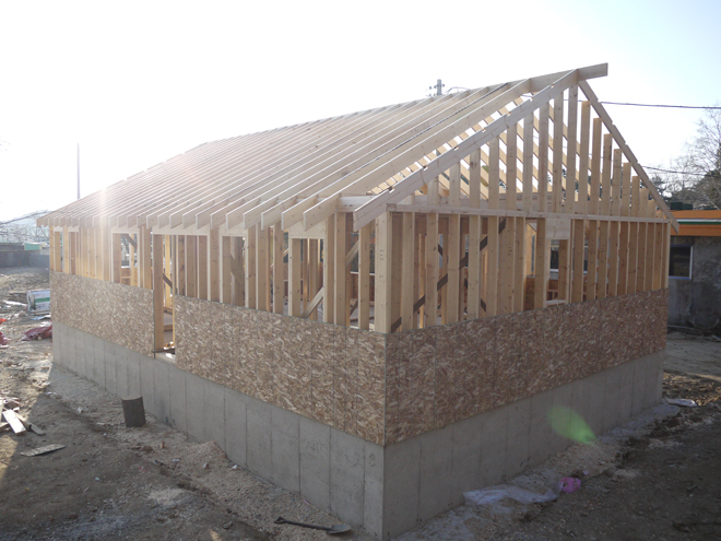 서까래를 걸기전 가급적이면, 외부합판 OSB를 아래 한단정도는 둘러주어야만, 서까래 시공시 작게나마 횡방향으로 밀리는 힘을 잡아줄 수 있습니다.