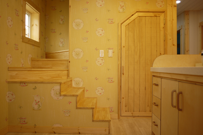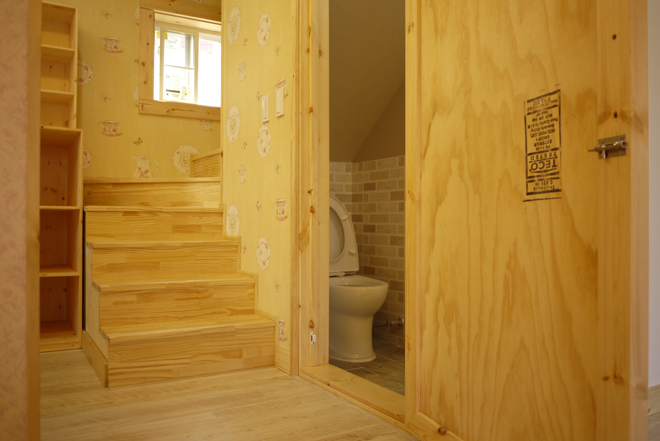본 가정에는 애기들이 많고 오전시간에 화장실이 부족할 것 같아 계단실 아래 공간을 간이 화장실로 꾸며 보았습니다. 문은 12mm 두께에 4“ 폭의 북미산 아라우코합판입니다.