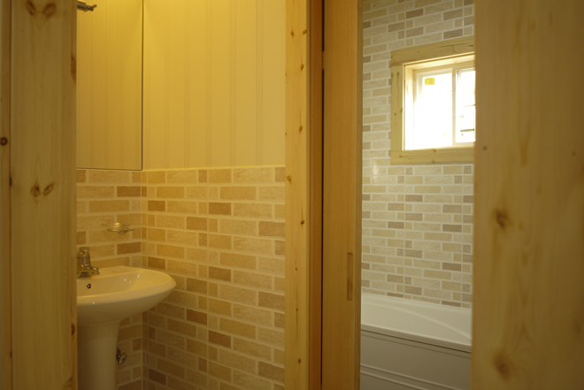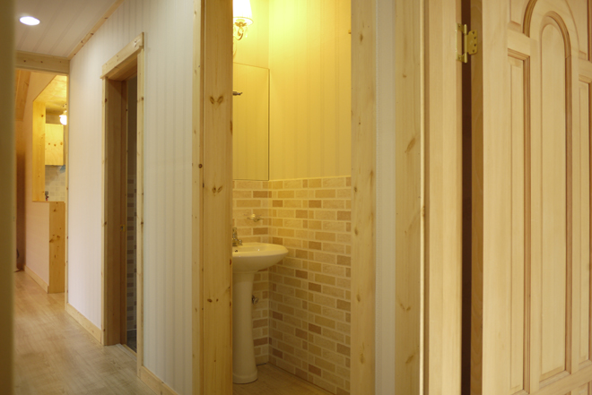 주거실 상단의 베이스는 스웨덴 레드파인 루바이고 루바위에 원목으로 만들어진 보는 유럽산 1×4/1×6/1×8 사이즈로 19mm 두께의 원목이 사용되었습니다. 실내 벽체의 코너와 천장코너는 물론 방문과 창호에 사용된 원목 몰딩도 마찬가지로 모두 유럽산 19mm 원목을 사용하였습니다.