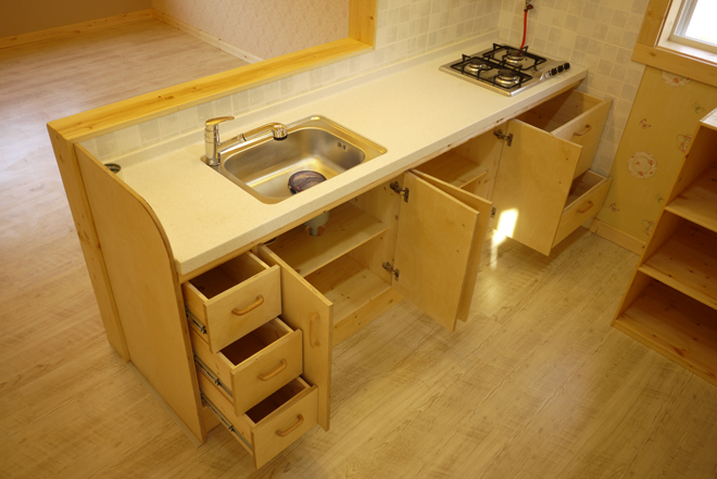 원목무늬가 화려한 자작나무 합판에 어울리는 손잡이는 건축주 사모님께서 직접 선택하셨습니다. 씽크대 왼쪽 옆판도 18mm 자작나무를 사용하였습니다.