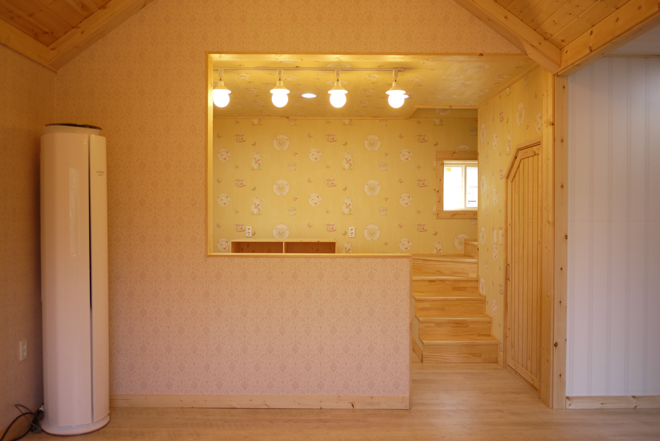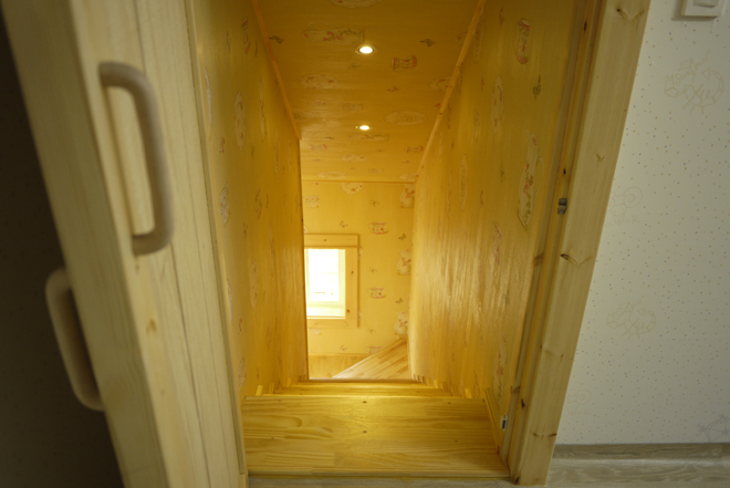다락방으로 올라가는 계단실 내부 모습입니다. 계단실 천장등은 과열 방지와 서까래쪽으로 열손실을 막기위해 LED 소형 매입등을 사용하였습니다.
