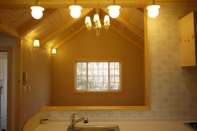 다락방으로 올라가는 중간 계단참에서 뒤돌아 내려다 보이는 주방내부 모습입니다.
