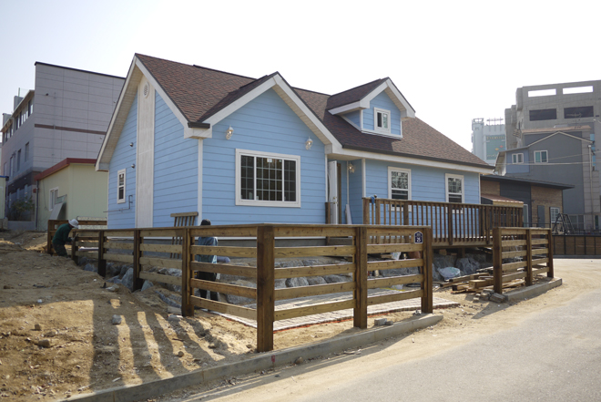 아직 대문과 현관입구에서 내려오는 계단은 완성되지 않은 상태입니다. 울타리 POST는 6×6 이며, 기둥을 가로 지르는 펜스는 2×6 방부목입니다. 특히 울타리를 시공할 때 기둥의 부재를 너무 작은 사이즈를 선택하면, 2~3년을 넘기지 못하고 흉물이 되어 버리는 경우가 많습니다. 울타리 시공시 공사비가 조금 부담되더라도 꼭 참고하시기 바랍니다.