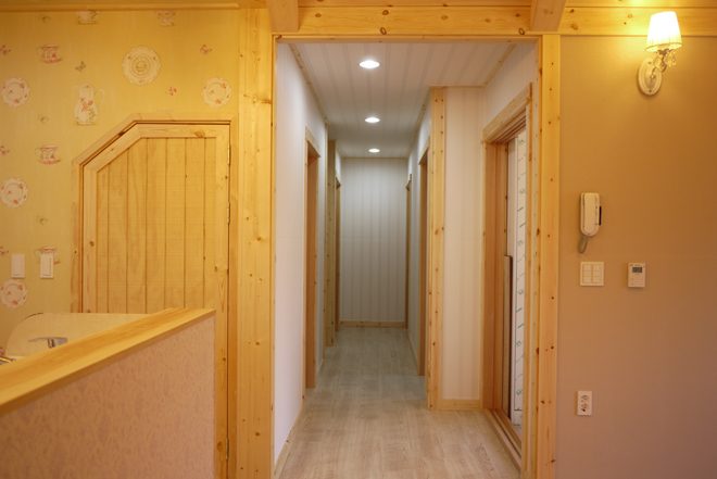 거실에서 각 방으로 연결되는 복도의 모습이며, 24평의 1층 바닥평수에 가족구성원들을 위한 각 공간을 확보하기엔 복도형 설계를 디자인을 선택하였습니다.