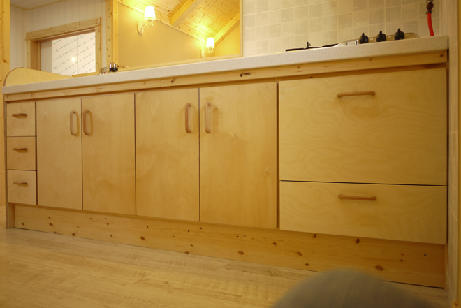 제작 및 시공하는데 정성을 많이 쏟은 자작나무 씽크대입니다. 내부틀 역시 사이드핑거 조인트로 된 유럽산 집성원목이며, 문짝은 18mm 자작나무입니다. 도색은 미국산 Minwax 우레탄 반광 도료입니다.
