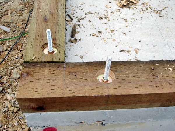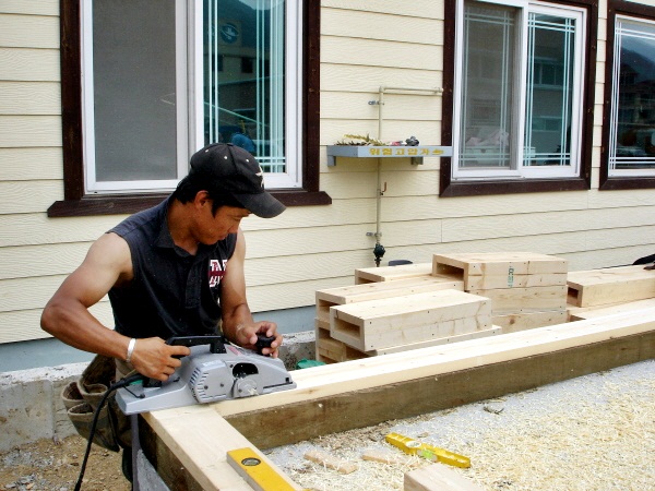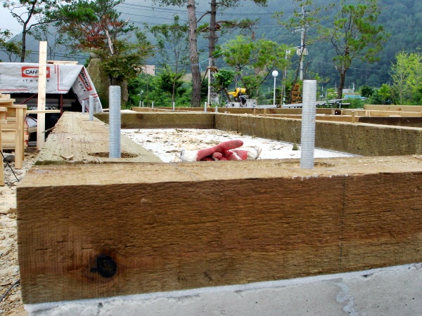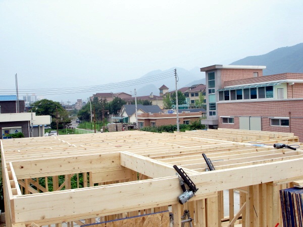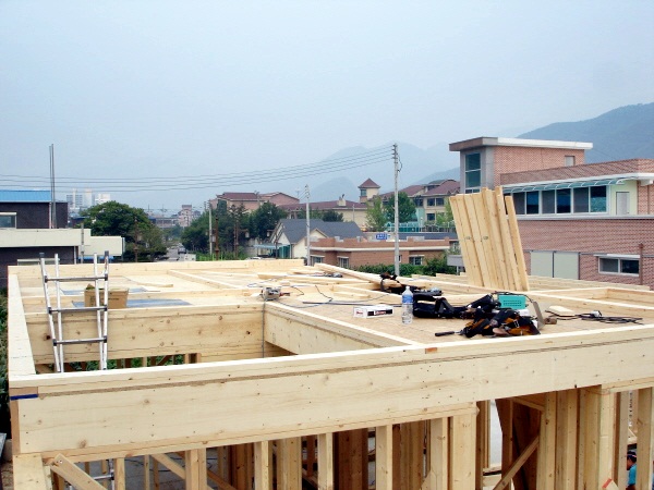 ![]() 기초위에 맨 처음 깔려지는 목재로써, Mudsill이라 하지요. ![]() 현재는 수입되지 않는 유달리 다루기 힘든 "4*6' 사이즈 CCA 방부목입니다. ![]() Mudsill 작업이 끝나고 Double Plate를 시공준비하고 있습니다. ![]() Mudsill(토대)을 깔고, Double plate (밑깔도리)를 올린후 외부벽체 가장자리는 물론 내부 벽체선까지 모두 레벨선 표시를 하고 대패작업으로 집이 앉혀지는 자리 전체의 바닥수평을 똑같이 맟춥니다. 사실 골조공사 작업시 쐐기를 고아서 수평을 잡는 것 보다 꼬박 하루가 더 걸리는 공정입니다. 하지만 대패작업을 하는 과정과 마치는 순간까지 정밀시공을 눈으로 확인하면서 만족해하고 신뢰하는 건축주분들을 볼 수 있었습니다. 이에 저 역시 일에 대한 보람과 신뢰를 얻을 수 있었구요. 그래서 굳이 얘기하지 않아도 대패작업이 한양하우징의 영원한 약속이 되었답니다. 지붕물매는 12:7, 각도는 30.26도이며, 처마길이 500mm 빼면, 벽체아래로 내려오는 처마선은 마감까지 400mm 그러므로 창문의 인방은 상부Topplate에서 최대한 400mm이상은 내려와야 마감이 떨어집니다. 그래서 모든 창호및 외부문인방은 2*10으로 제작하였습니다.