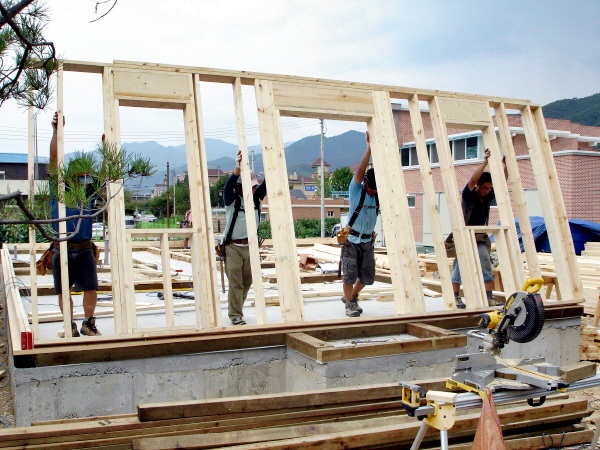 벽체의 Stud 높이는 현장마다 도면에 따라 다르게 갈수 있지만 일반적으로 단열재 높이인 92" 5/8로 재단을 합니다.내부 단열재 시공시 물론 단열재를 평평하게 펴서 시공하는 것이 무엇보다 중요합니다.국내에 유통되는 골조자재의 종류는 등급은 주로가 2등급이며, 그중에 급수에 따라 가격도 달라집니다. 첫째. 2&BT급은 curve, twist 등의 휨자재와 피죽이 섞여있는경우가 많습니다. 둘째. Prime등급은 피죽은 거의 없으나, curve, twist등의 휨자재는 별반 차이가 없습니다. 셋째. Hileline/J Glade등급은 피죽은 일체 없으며, curve, twist 등의 휨자재도 거의 없습니다. 10년이상 목조주택만 공사해온 저희 한양하우징의 공지사항 골조공사 사진을 보시면 어떤한 현장에서도 피죽을 찾아볼 수 없을겁니다. 저희는 항상 Hileline/J Glade등급을 사용하였습니다. 좋은 재료는 항상 일하는 사람도 즐겁습니다